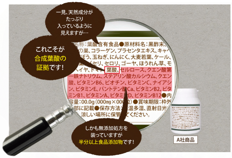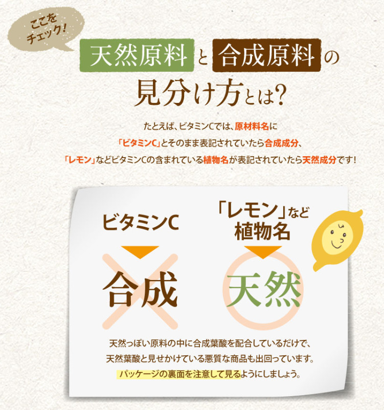 つまり原材料に「葉酸」とでているものは天然成分ではなく合成葉酸を使っているということです